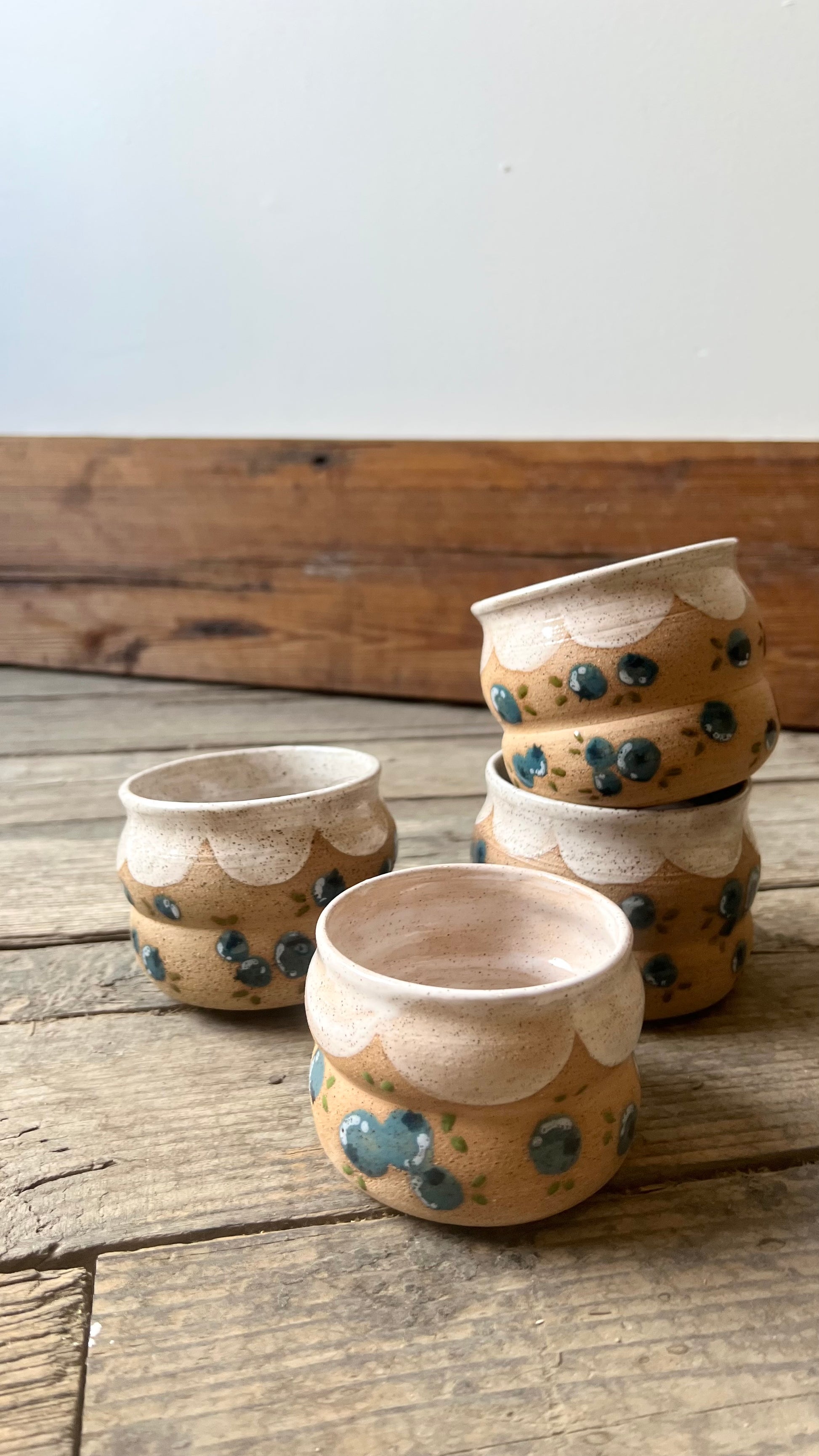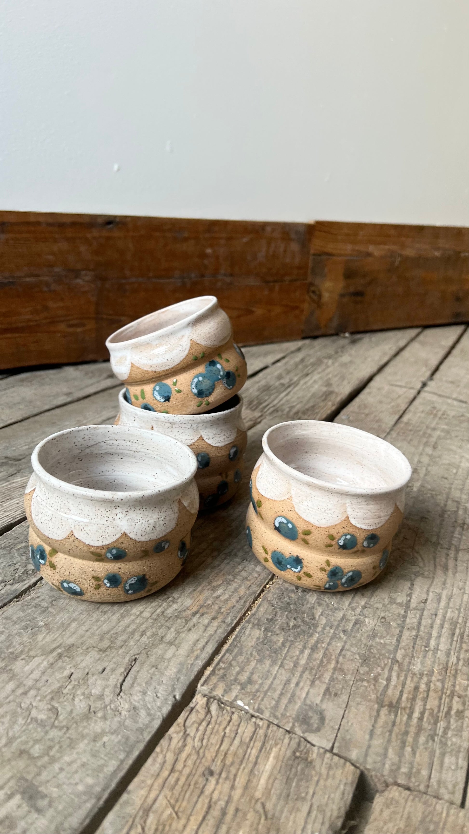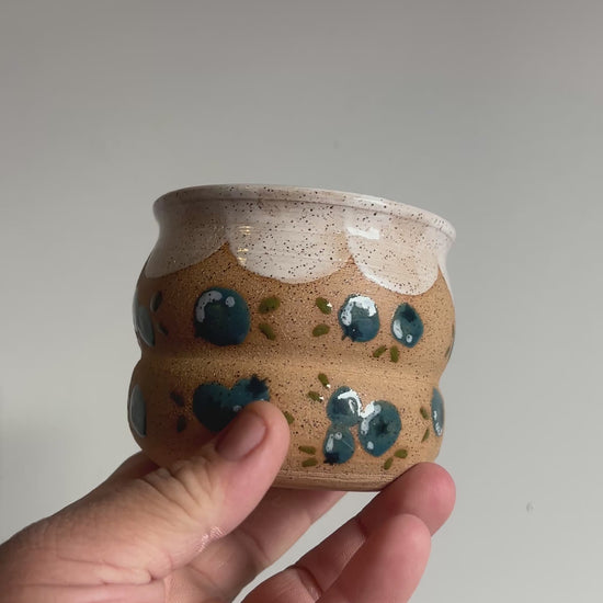 Beautiful Blueberry Cups or can also be great for a second purpose to hold your blueberrys as a snack cup. Each cup is hand thrown, hand glazed and hand painted.